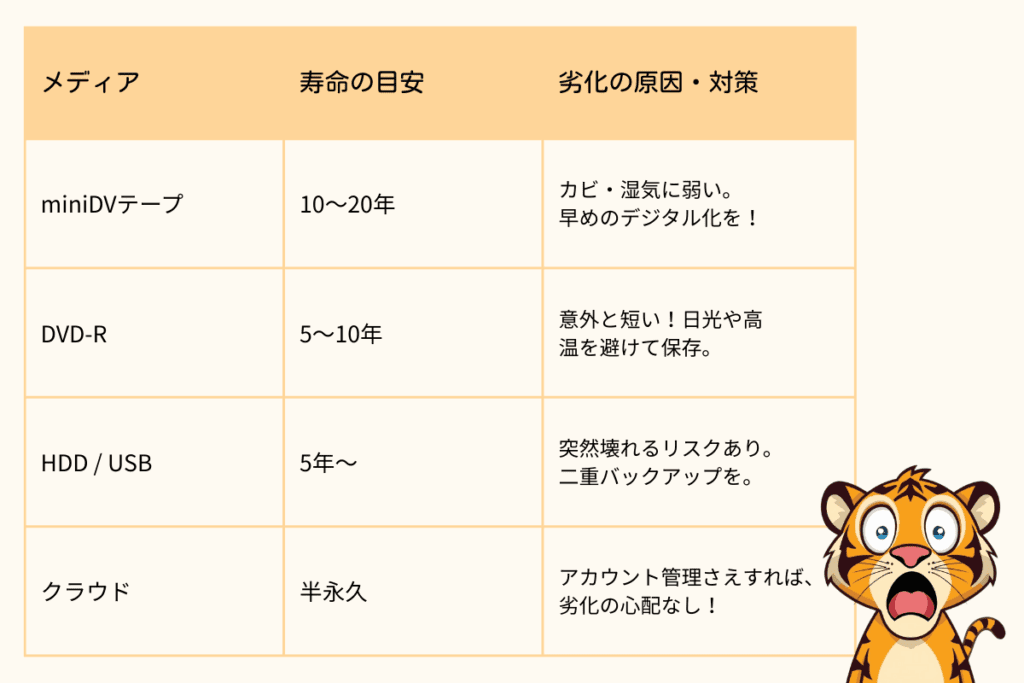 「保存しているだけで確実に劣化」します。具体的にあとどれくらい時間が残されているのか、目安を確認しておきましょう。